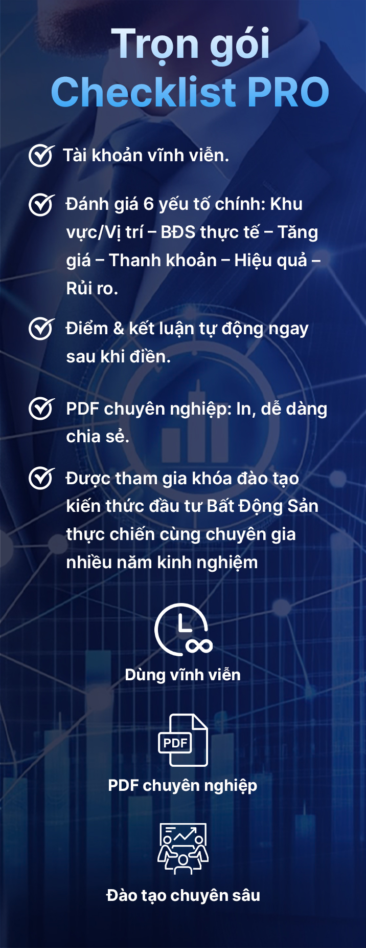 Bộ Checklist & Quy trình đầu tư dành cho nhà đầu tư bất động sản. Điền tiêu chí → Chấm điểm tự động → Kết luận → Tải PDF. Lưu & dùng nhiều lần lại.