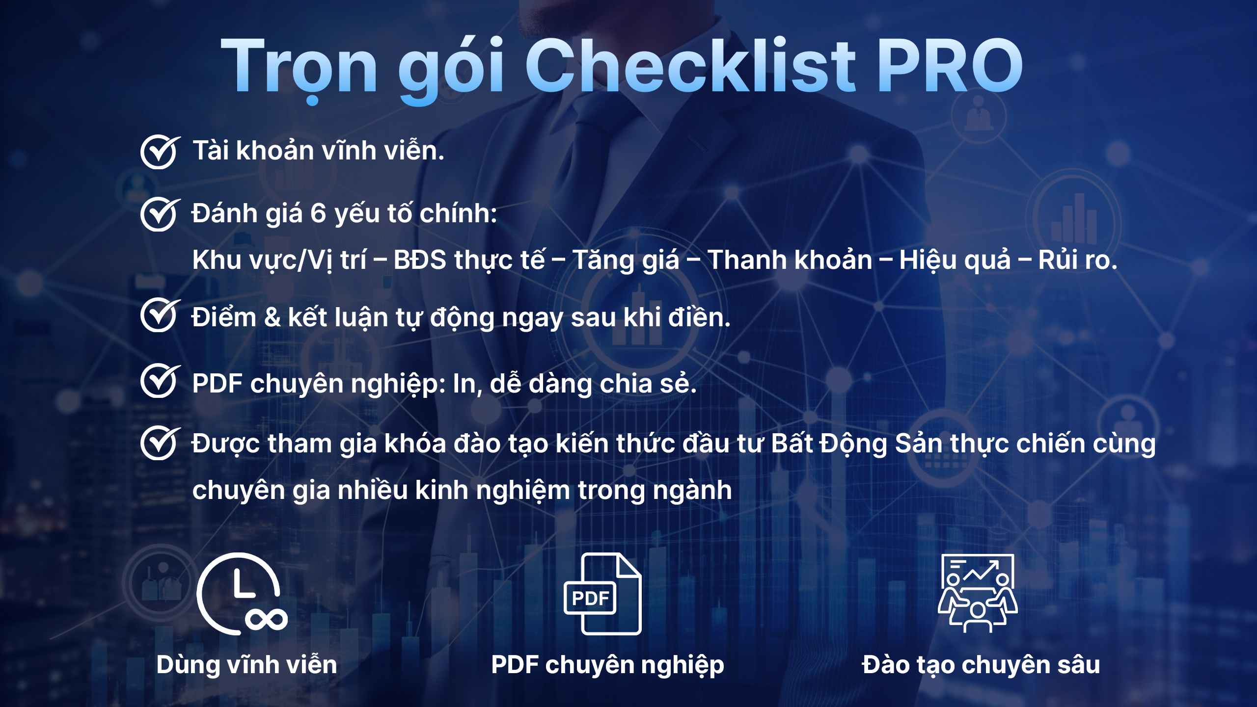 "Dùng Checklist Pro cho 2 dự án thấy 1 cái rủi ro pháp lý, may không xuống tiền."– Anh T., Q.7, HCM